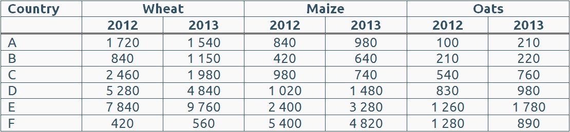 If, between 2013 and 2014, maize production falls by 20% in country E and remains constant in the other five countries, by what percentage will maize production fall in the six countries taken as a whole between 2013 and 2014?
