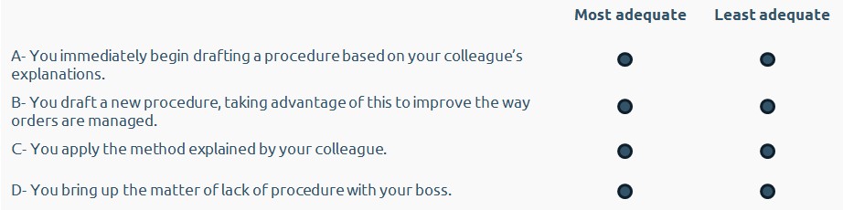 Each question comprises a work-related scenario and a number of possible actions. The candidate must assess the effectiveness of each action.